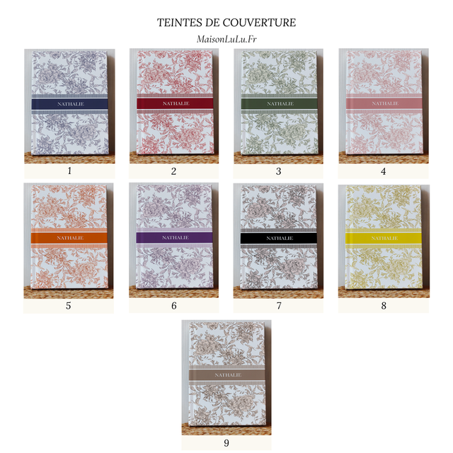Personnalisation incluse : texte de couverture, texte du dos, typographie au choix et coloris du carnet.