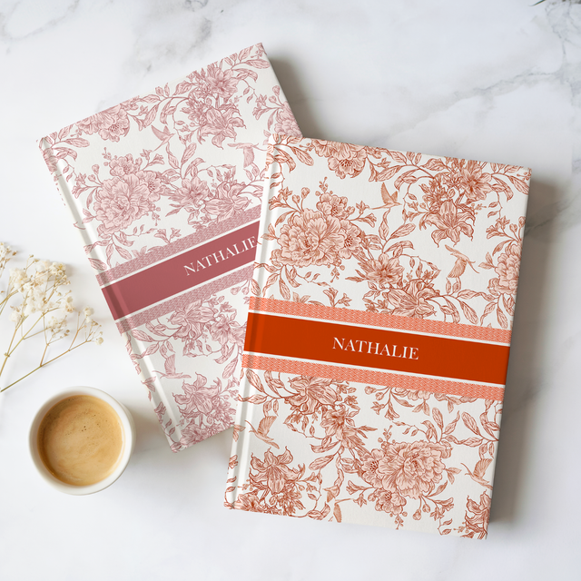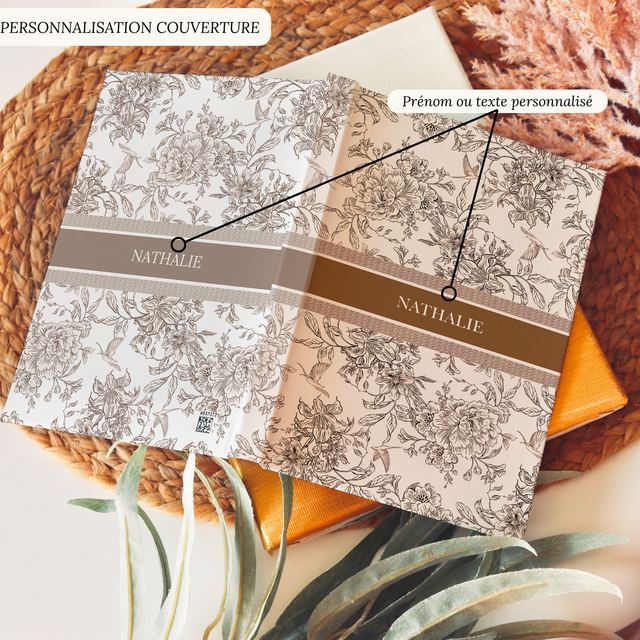 Carnet personnalisé joli motif fleurs et oiseaux toile de jouy